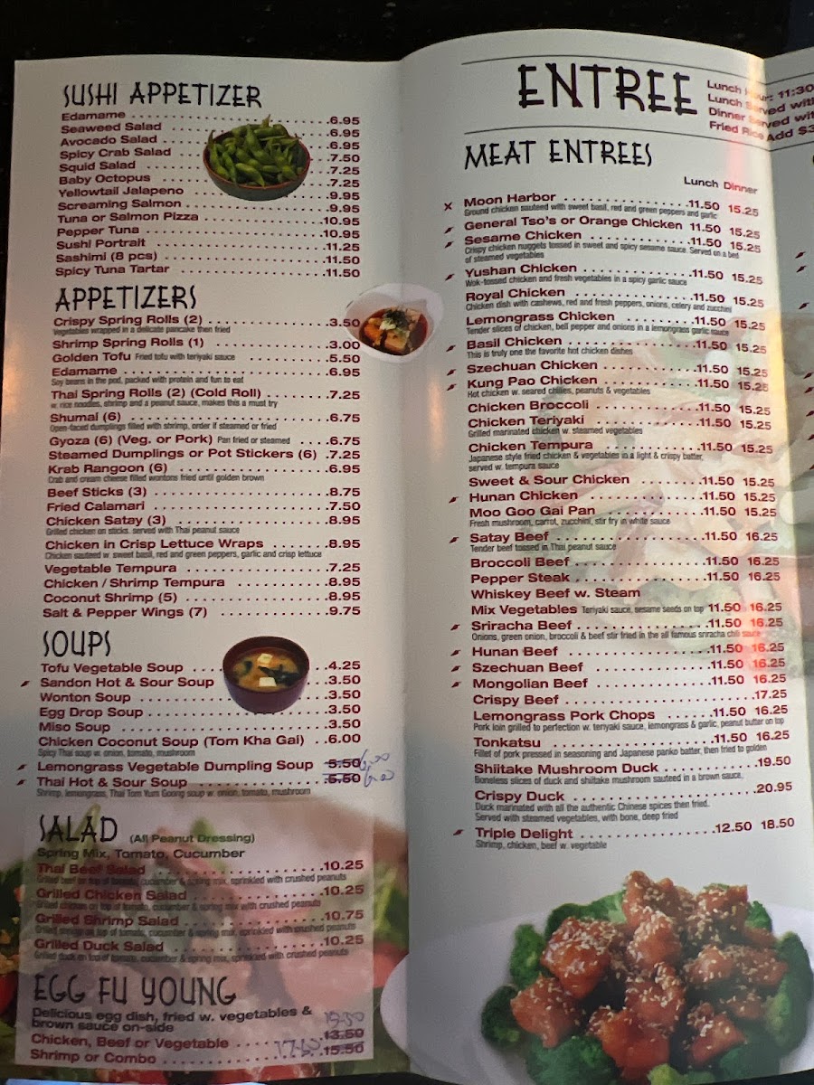 If you’re in the mood for a hearty meal, the California Roll offers a familiar, yet always satisfying option, while the General TSO Shrimp brings a bold and savory flavor with a kick of heat, perfect for seafood enthusiasts. For those craving something with a little extra flair, the Basil Fried Rice w Shrimp offers a fragrant and flavorful dish, bursting with herbs and perfectly cooked shrimp. Additionally, the Lo Mein is another comforting classic that combines tender noodles with savory sauce and your choice of protein. Lastly, the Larb, a Thai-inspired salad, adds a refreshing and zesty flavor to the menu, ideal for anyone looking to enjoy a lighter, yet flavorful dish.